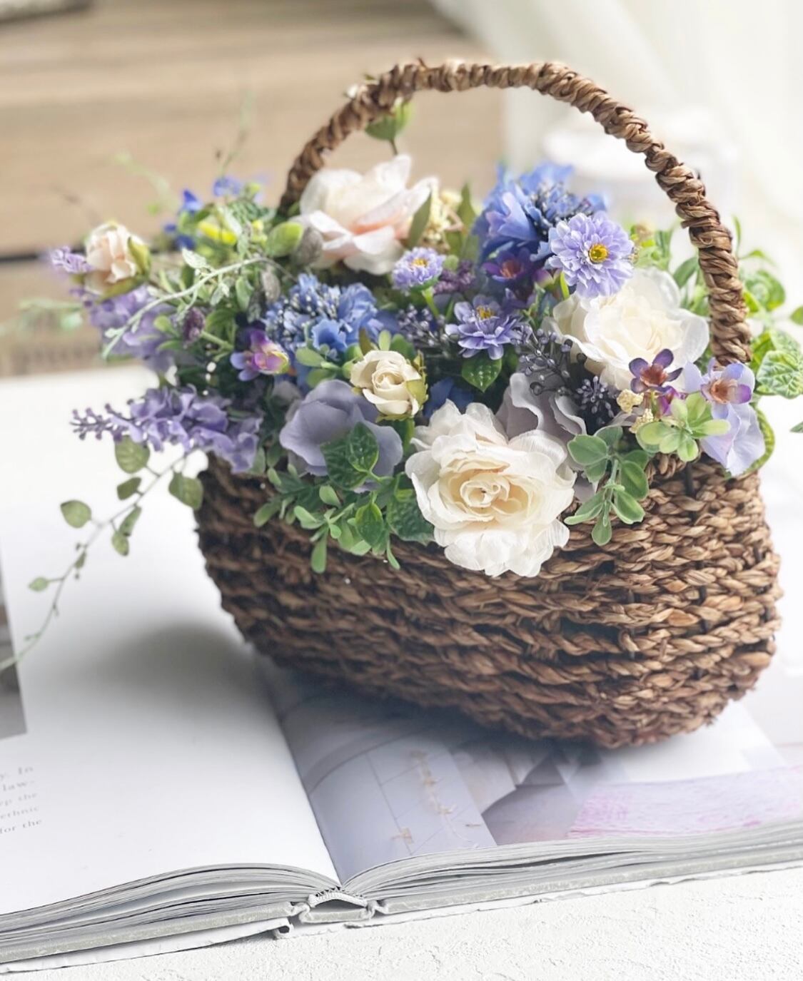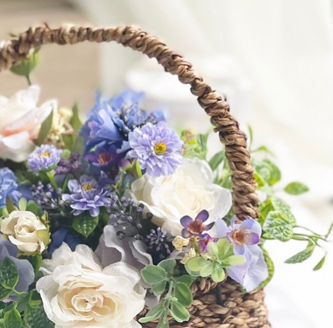 ブルー系のお花とホワイトローズのお花を使用しふわふわ可愛いく繊細にアレンジしております。
